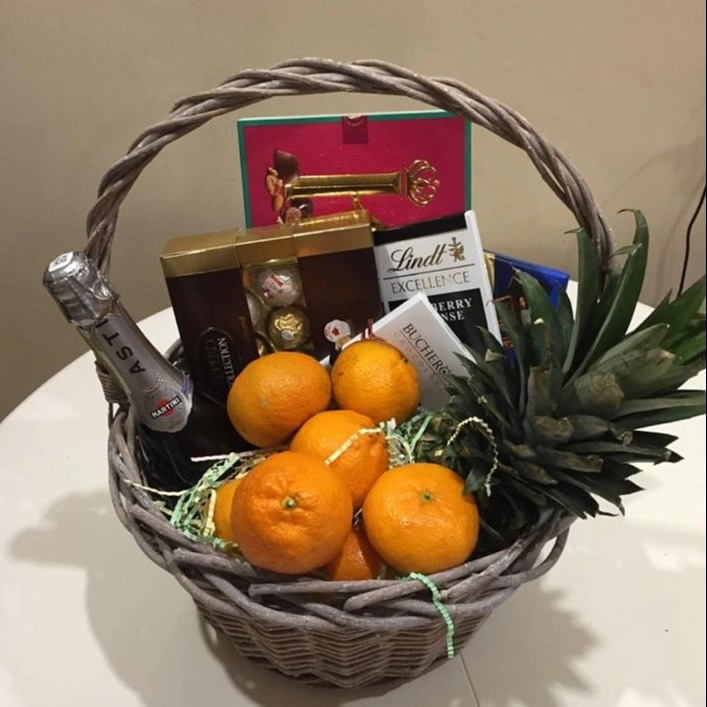 Оригинальная корзина на новый год с конфетами, мандаринами и ананасом.