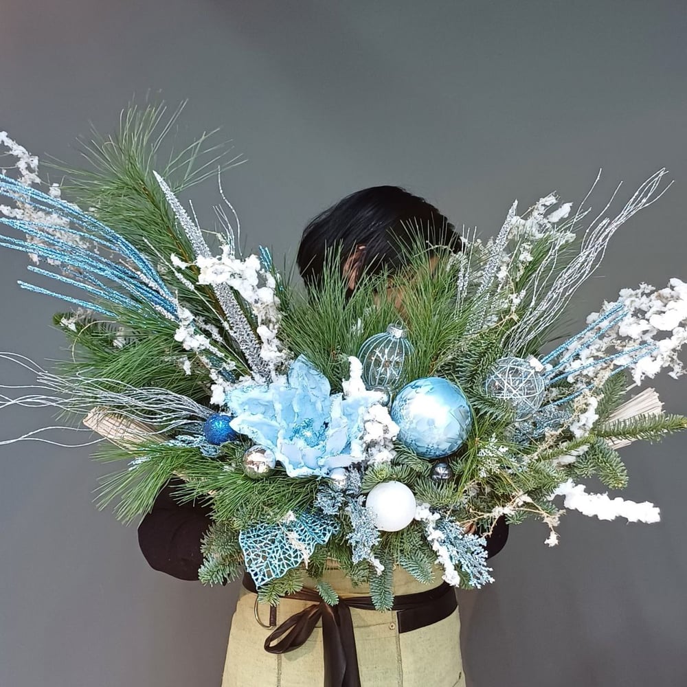 Новогодняя композиция из нобилиса и сосны с новогодними игрушками голубого цвета — это элегантное, стильное и волшебное украшение, которое создаст атмосферу зимней сказки в вашем доме. Голубые игру...