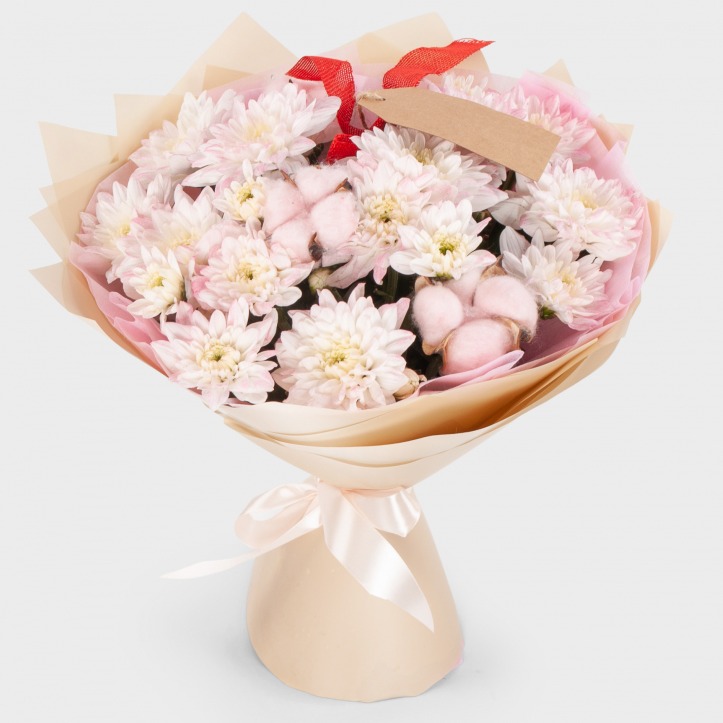 Полный нежности и пожеланий добра и счастья, этот букет станет прекрасным подарком к празднику для важного и близкого человека. Белые хризантемы с легким налетом розового цвета на кончиках лепестков идеально сочетаются с пышными соцветиями хлопка и многослойной упаковкой из светлой бумаги.