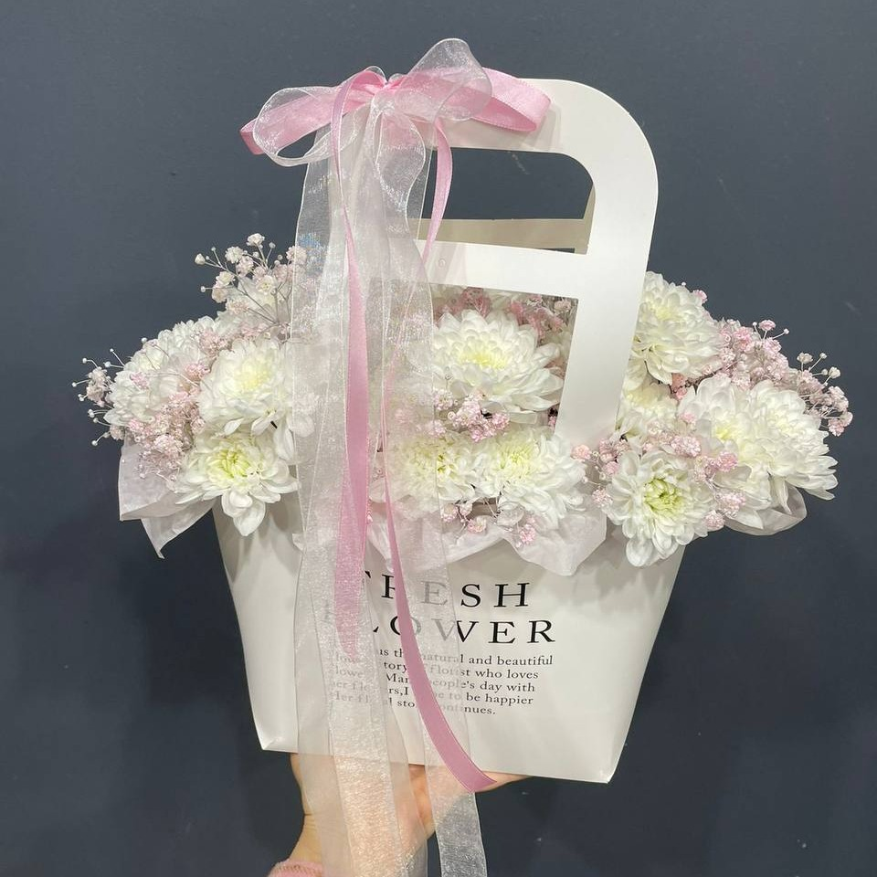 Шляпная коробка с цветами «Облачко» из хризантем и гипсофил