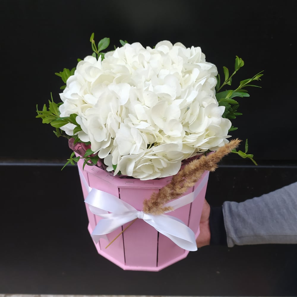 Красивая и оригинальная композиция из гортензии в деревянной шляпной коробке украшенной лентой и сухоцветом