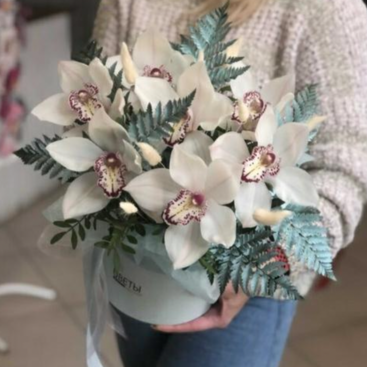 Экзотичная орхидея цимбидиум с папоротником смотрится гармонично в шляпочной коробке. Шикарные цветы будут долго радовать и доставлять своей красотой массу самых позитивных эмоций 😍 дарите радость...