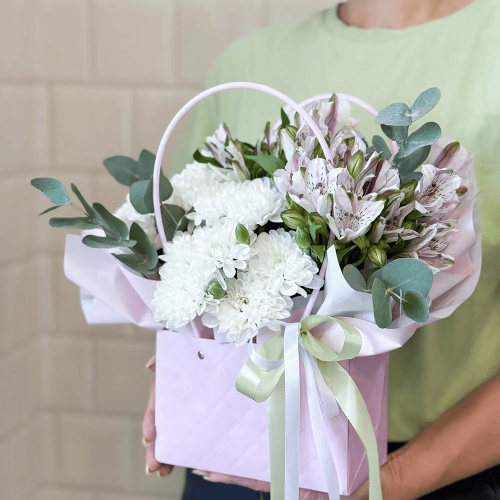 Альстромерия 4 Хризантема мелкоцвет 4 Эвкалипт 0.2 Сумка Оазис