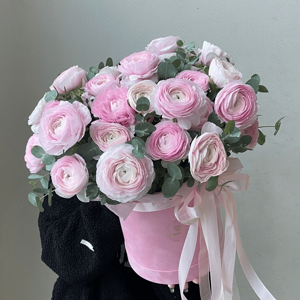 Очарование ранункулюсов в шляпной коробочке Погрузитесь в мир утонченной красоты с нашей эксклюзивной композицией из розовых и белых ранункулюсов, дополненных элегантными веточками эвкалипта. Эт...