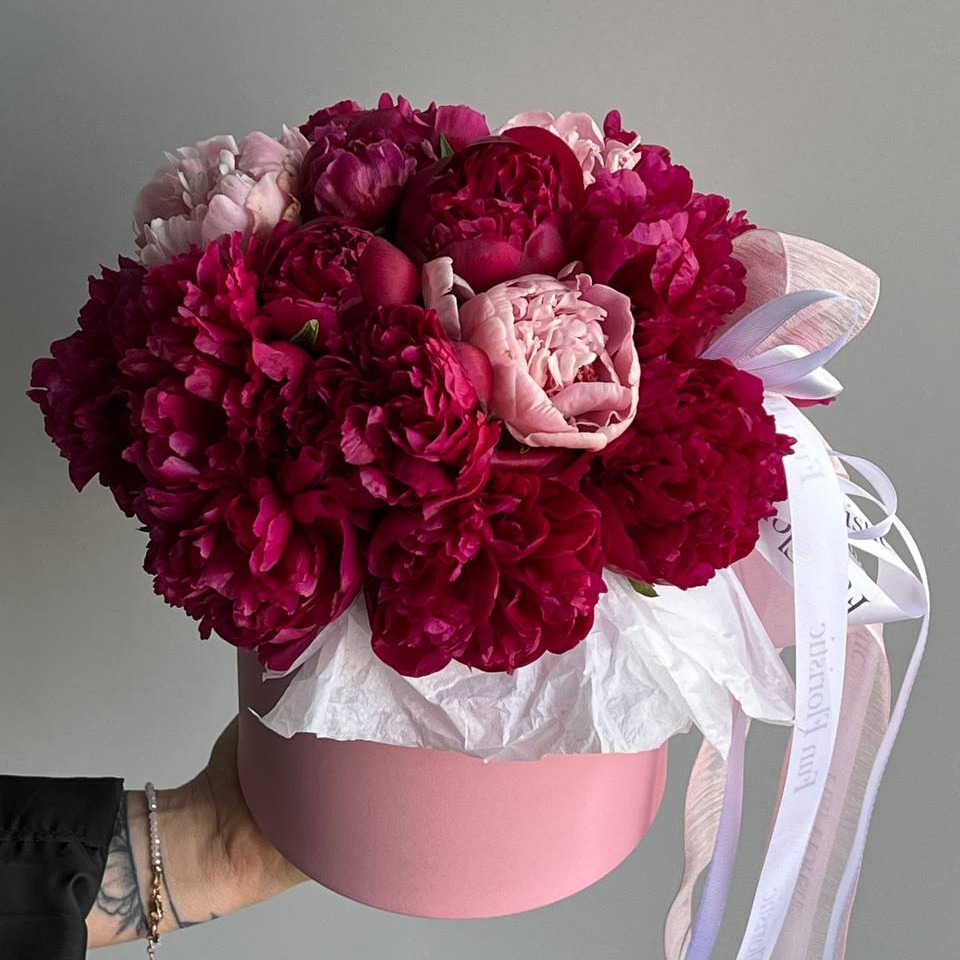 Шляпная коробка с цветами «Очаровательная бомба» из пионов