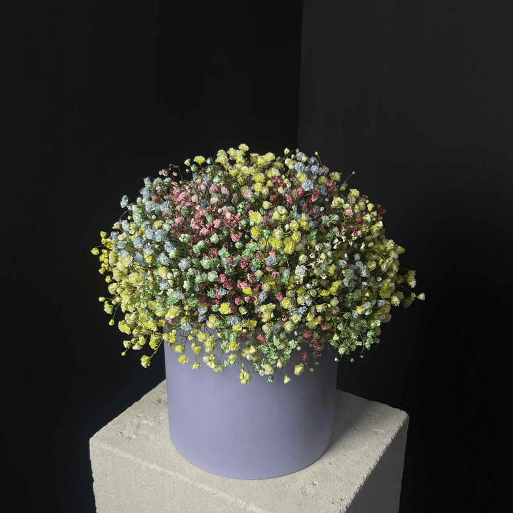 Шляпная коробка с цветами «Огниво» из гипсофил