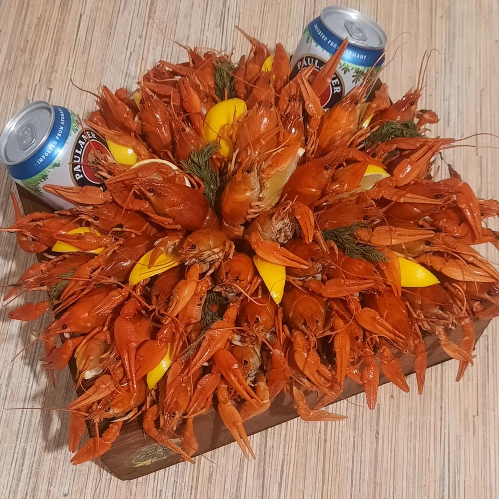 Раки варёные Лимон Зелень Деревянный ящик Пиво 2 бутылки