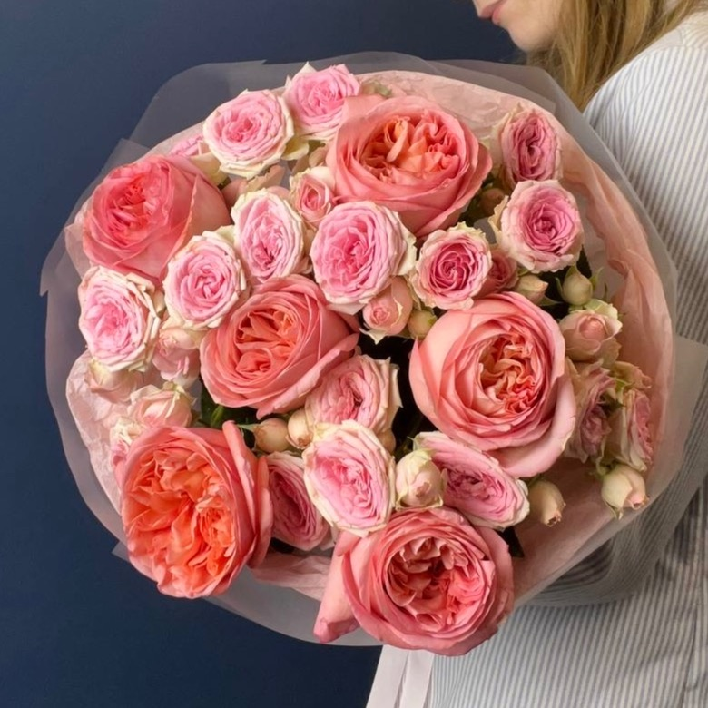 Нежный и утончённый букет из кустовых и пионовидных роз, выполненный в мягкой розовой палитре. Пышные пионовидные розы создают объём и ощущение воздушности, а кустовые розы добавляют живость и есте...
