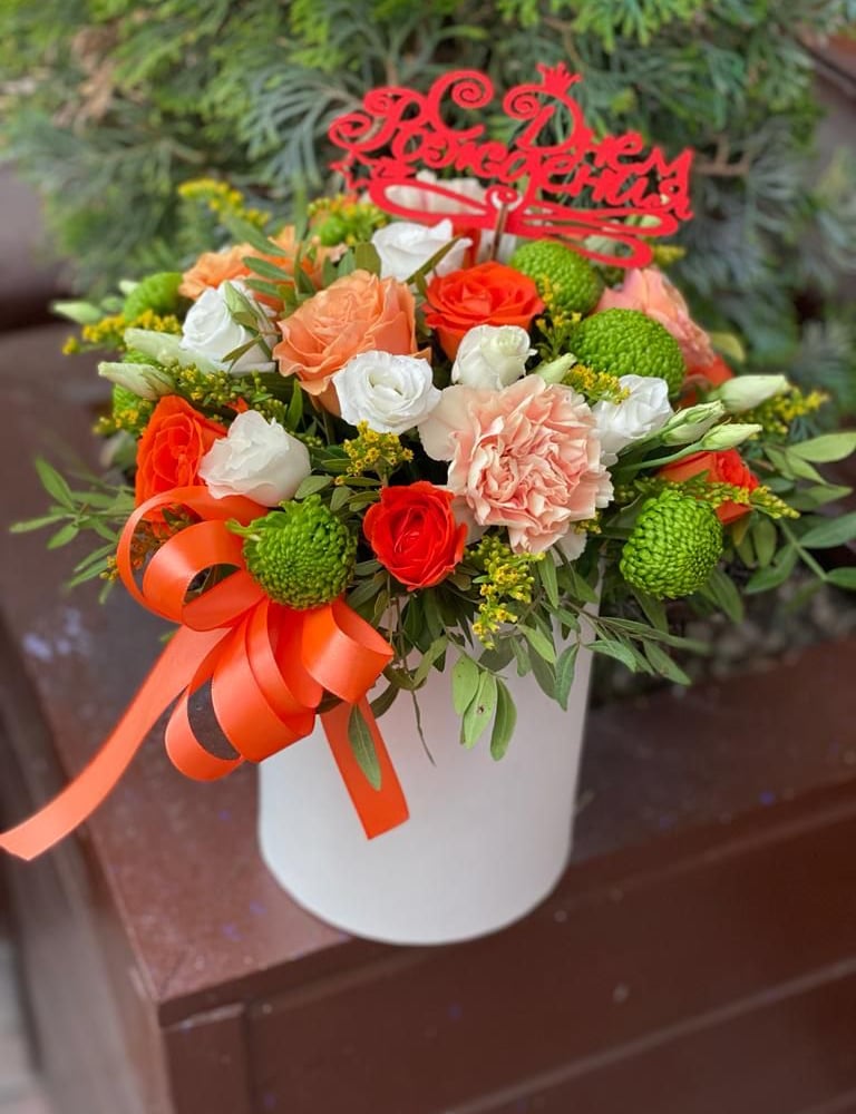 Шляпная коробка с цветами «Оранж» из роз и эустом