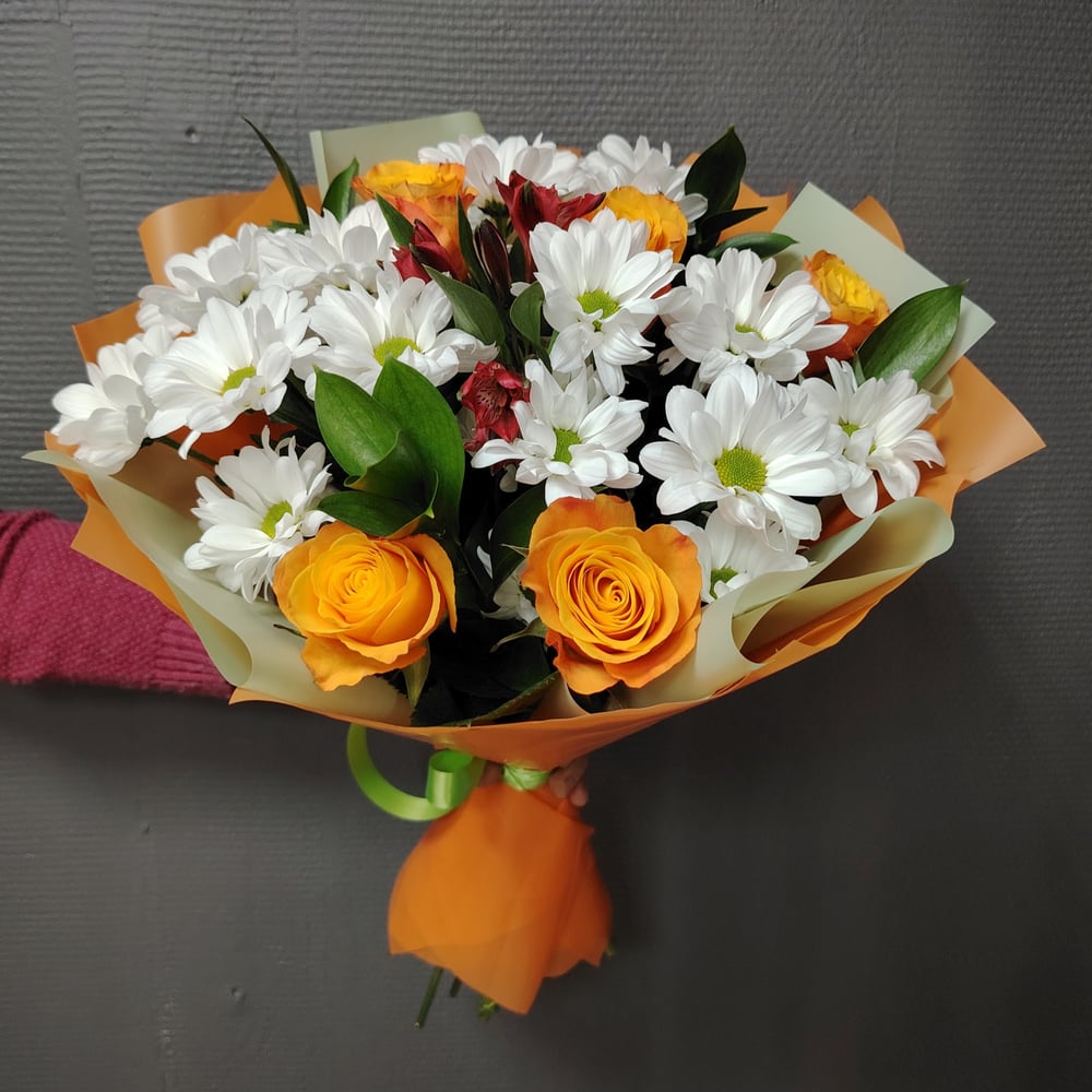 Букет «Оранжевое настроение» из роз и хризантем