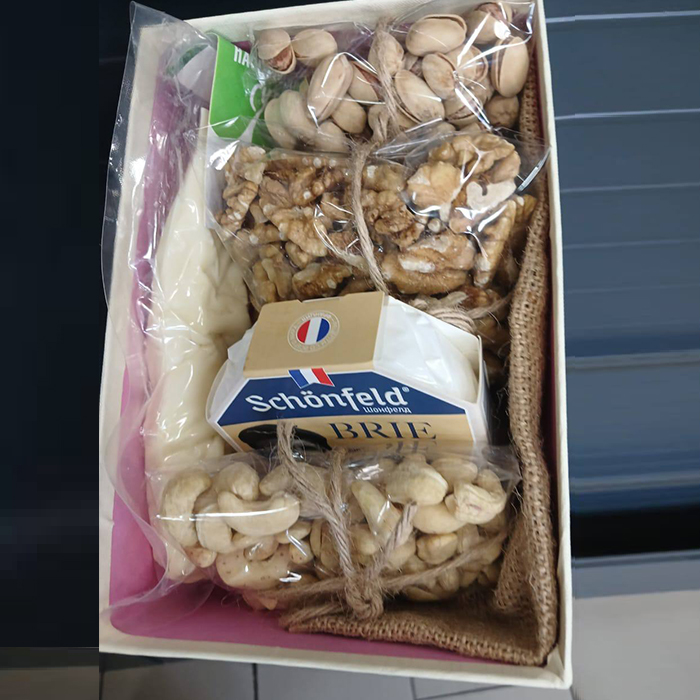 Презент в виде орехово-сырного набора отлично подойдет для тех, кто не успевает вовремя перекусить. Орехи полезны для остроты ума и поддержания физической активности, а сыр - это кладезь важных витаминов, которые так нужны людям, ведущим активный деловой образ жизни. Набор состоит из орехов кешью, грецких орехов, фисташек, сыра-косички и сыра Бри.