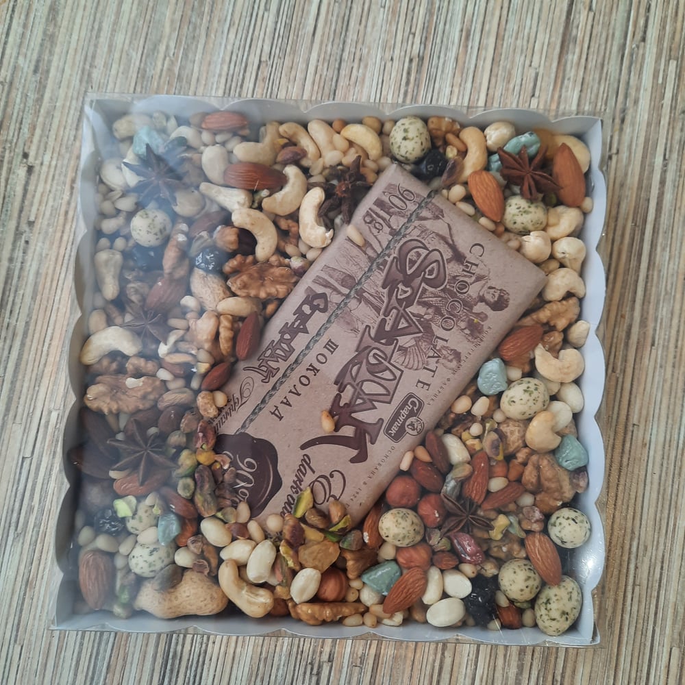 Наполнение бокса: горький шоколад, орехи кешью ,миндаль, сибирские, грецкие, арахис, фисташки, фундук, арахис в глазури, шоколадные камушки.