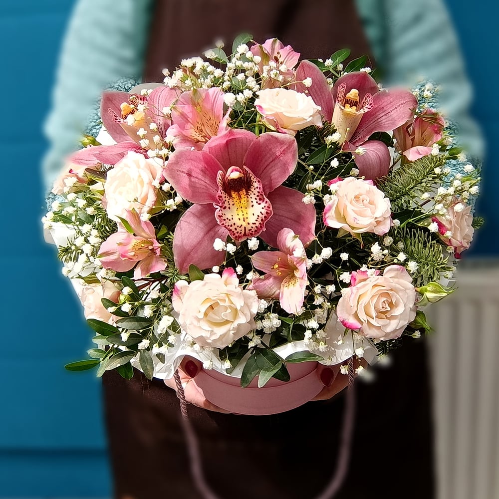 Шляпная коробка с цветами «Орхидея 1» из роз и альстромерий