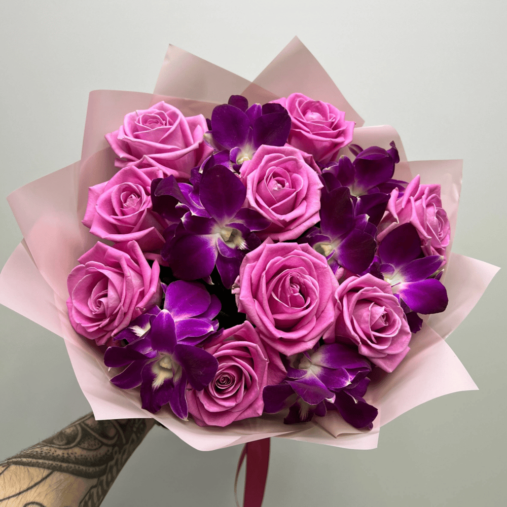 Букет «Орхидея Дендробиум пурпурная с розами»