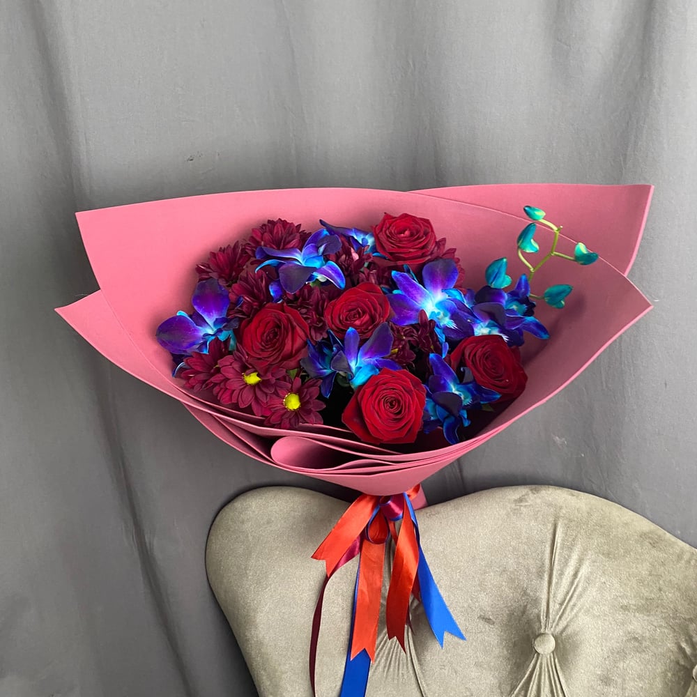 Букет с космической орхидеей и красными розами. Этот букет станет идеальным подарком для любимой девушки, жены, для мамы, сестры или бабушке просто как знак внимания и заботы, в день рождения, с...
