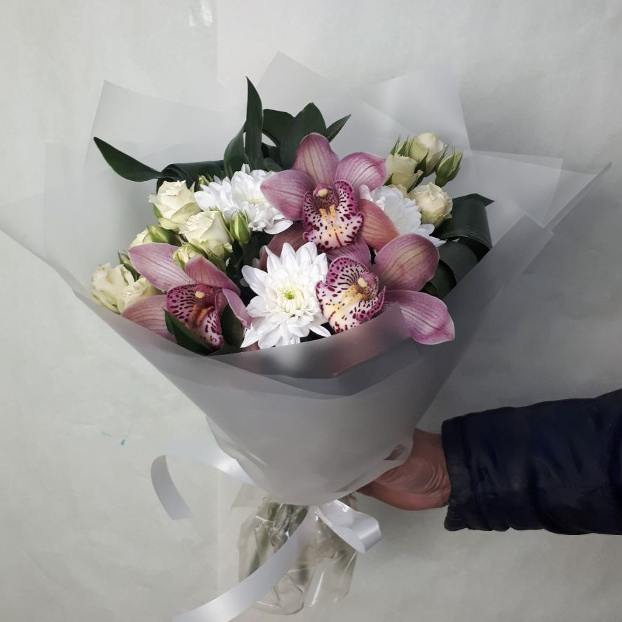 Букет «Орхидея с кустовой розой и хризантемой»