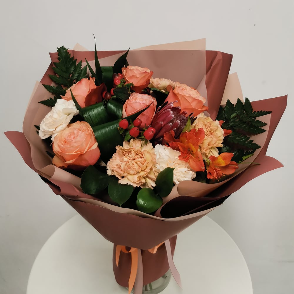 Бархатная мягкость осени, легкая ностальгия по уходящему теплу и золото крон сплелись в этом очаровательном карамельном букете, чтобы согреть сердце дорогого вам человека в этот осенний вечер.