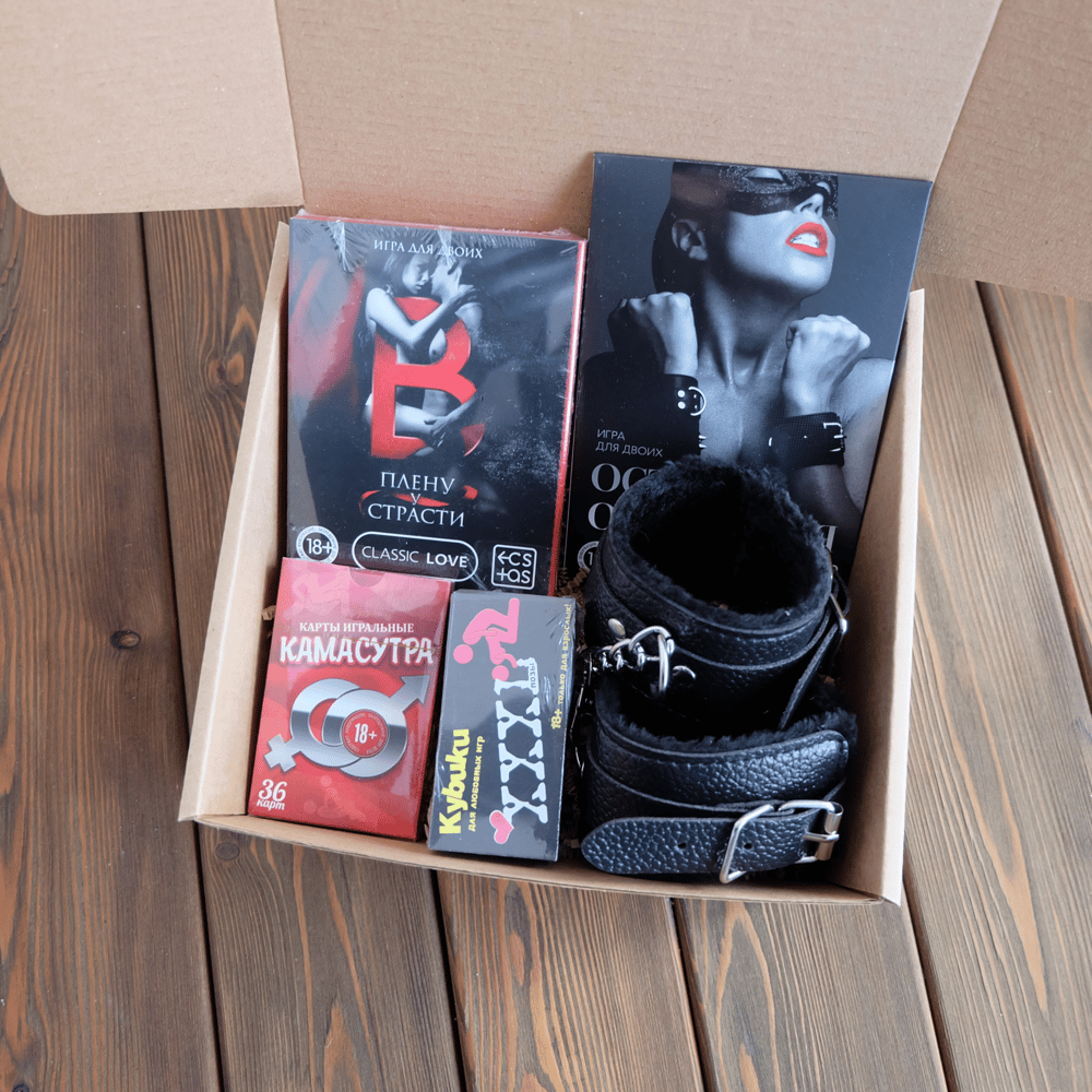 В наборе: 📌Коробка 20*20*9 см 📌Меховые наручники 📌Игра для двоих "В плену страсти" 📌Игра для двоих "Острые ощущения" 📌Игральные карты "Камасутра" 📌Кубики для любовных игр