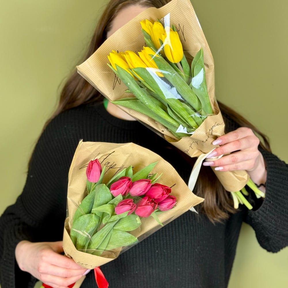 Пара букетов из 7 тюльпанов каждый — это изысканная композиция, способная привлечь внимание своим очарованием и разнообразием. Один букет может состоять из ярких, насыщенных тюльпанов красного и желтого цветов, создавая жизнерадостный и энергичный образ. Эти тюльпаны символизируют страсть и радость, привнося позитивное настроение. Второй букет может быть более нежным и романтичным, состоящим из пастельных розовых и белых тюльпанов. Такой ансамбль олицетворяет утончённость и чистоту, идеально подходя для выражения нежных чувств. Оба букета, будучи не только красивыми, но и сбалансированными по цвету и форме, создают гармоничный контраст и прекрасно дополняют друг друга.