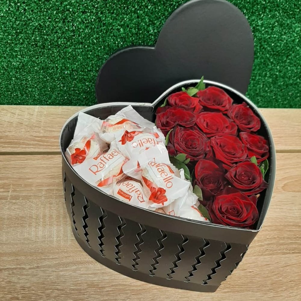 Коробочка роз в виде сердца с конфетами, лучше слов скажет о Ваших чувствах.