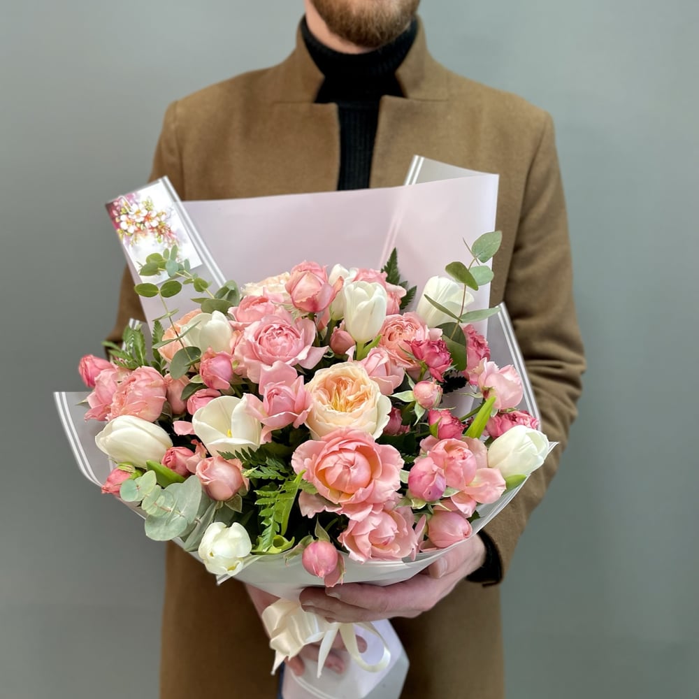 Букет «Персик» из роз и тюльпанов