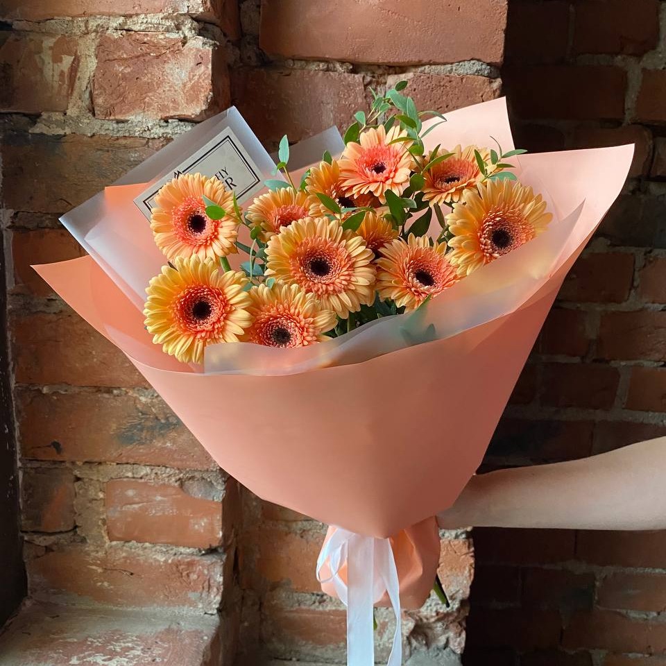 Букет из 11 персиковых мини-гербер и зелени в дизайнерской упаковке