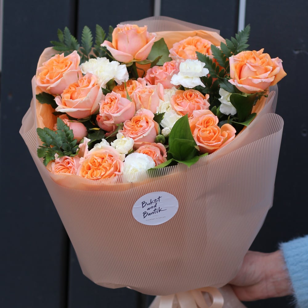 Сочный букет с кустовой пионовидной розой и контрастной гвоздикой с добавлением зелени. Может быть выполнен в любой цветовой гамме в зависимости от выбранного цвета розы.