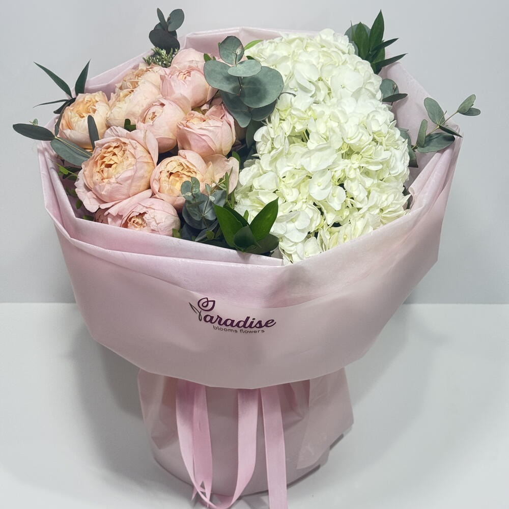Белая гортензия - 2 шт. Кустовые пионовидные розы - 5 шт.