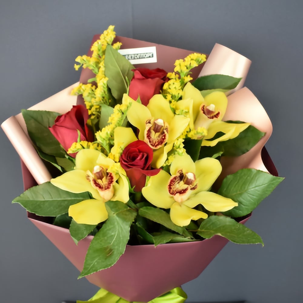 Компактный букет из Орхидей-Цимбидиум и красных роз, разбавлен зеленью солидаго, в оформлени из матовой плёнки. Прекрасный вариант для того, что бы произвести первое впечатление.