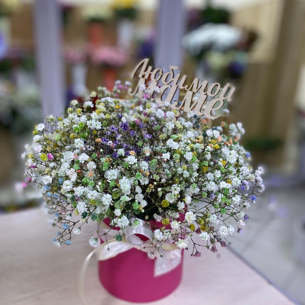 Шляпная коробка с цветами «Первая красавица» из гипсофил