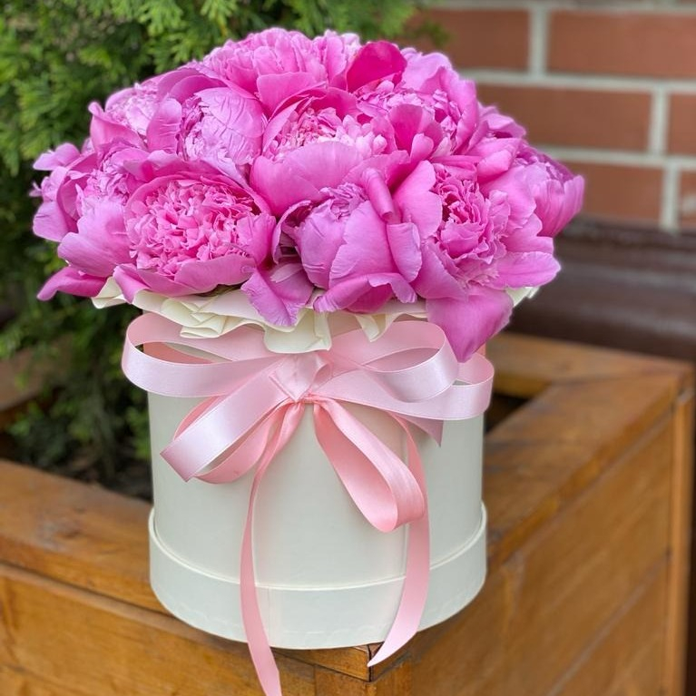 Шляпная коробка с цветами «Первый поцелуй» из пионов