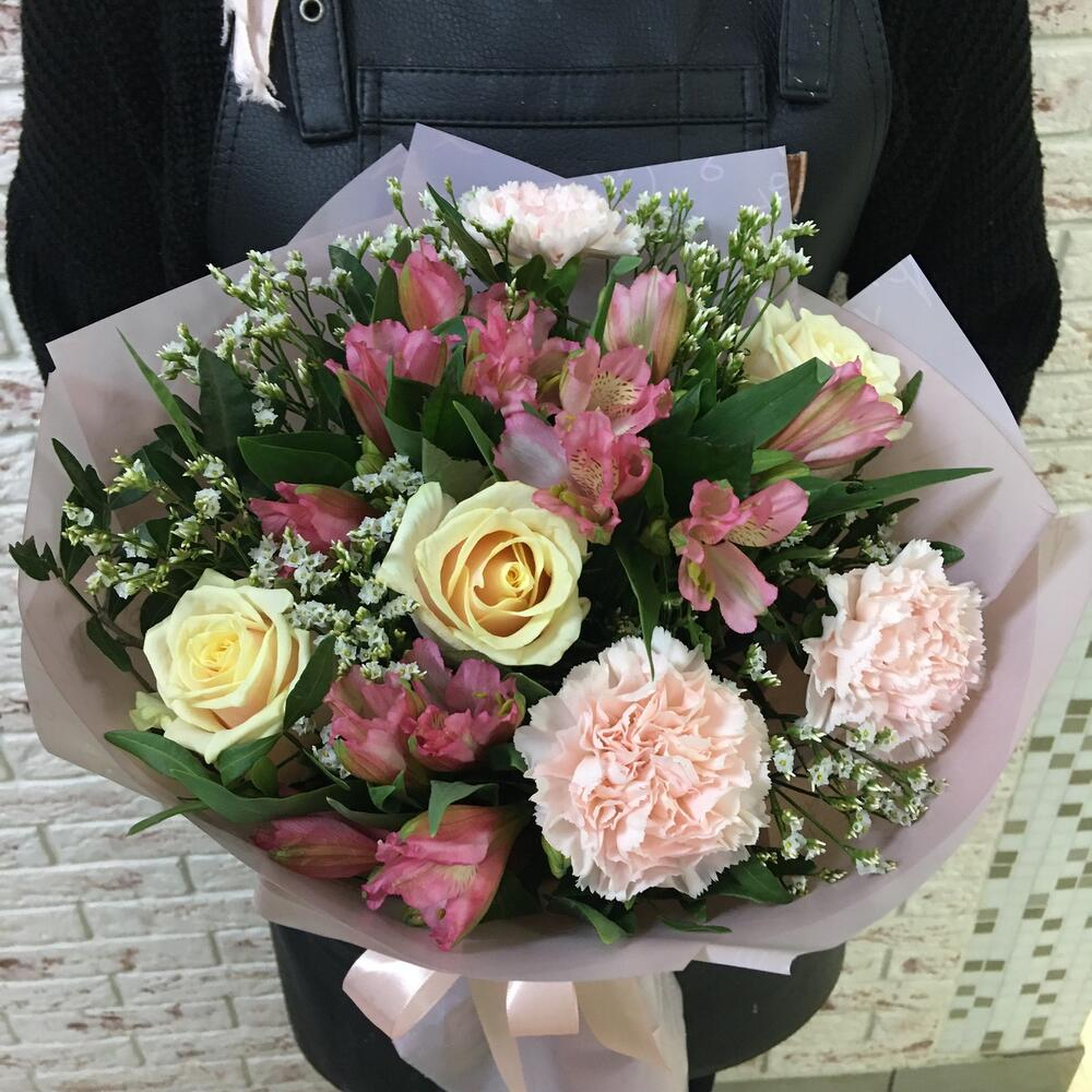 Нежный букет цветов в персиково-розовой палитре. Кремовая гамма роз гармонично дополнена пушистым диантусом и красивыми альстромериями.