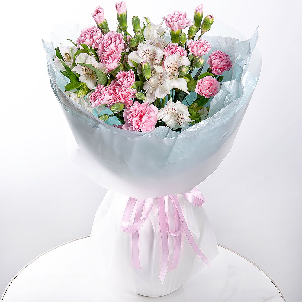 Букет, который выражает самые искренние чувства! Сочетание гвоздик и альстромерии в современной упаковке станет красивым символом любви и заботы.