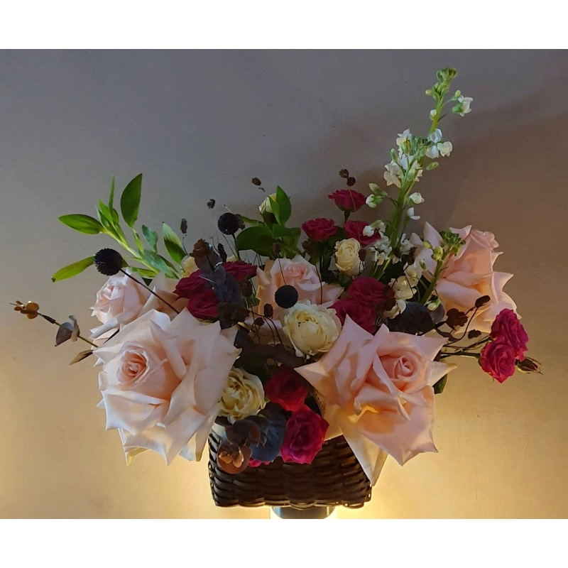 Корзина с цветами «Пикник в цветах» из роз и экзотических цветов