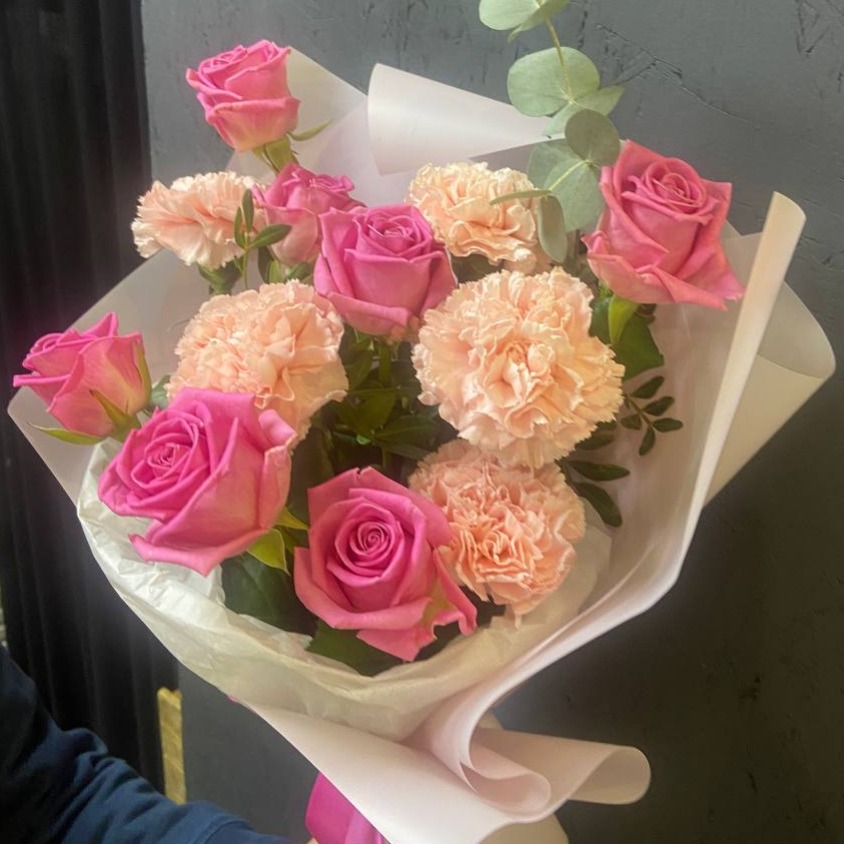Нежный букет в современном стиле, розы розовые и нежные диантусы с прекрасным запахом эвкалипта подарят самые яркие впечатления!
