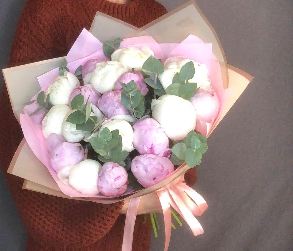 Восхитительные пионы с ароматным эвкалиптом. Стильный выбор на все времена.