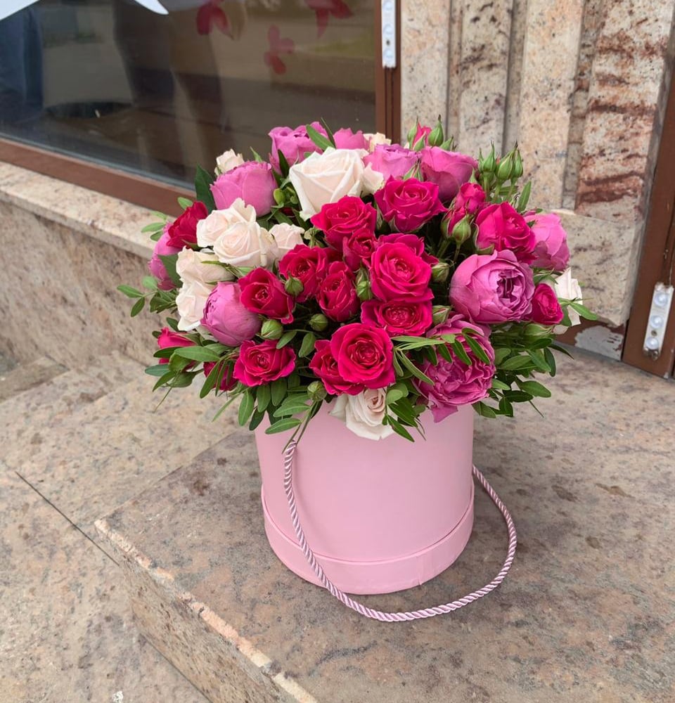 Цветочная композиция в шляпной коробке с пионовидной кустовой розой разной расцветки, зеленью.