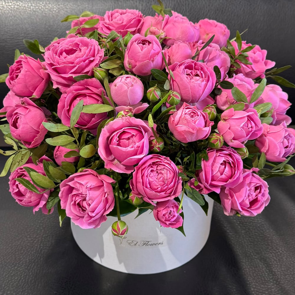 В композиции 15 веток кустовой пионовидной розы и пистаж. У розы присутствует приятный аромат цветов.