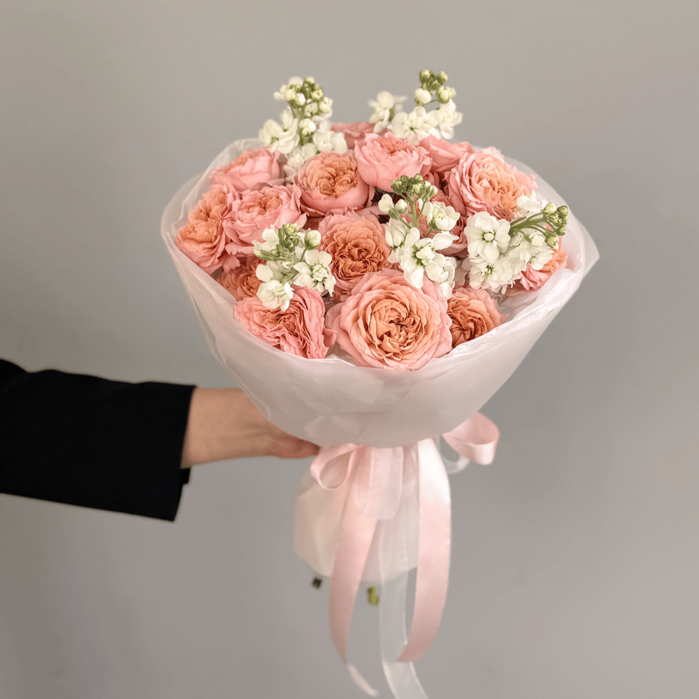 - кустовая пионовидная роза - 4 шт - маттиола белая - 5 шт Цветы, которые вдохновляют. Сочетание оттенков, форм и ароматов превращает обычный день в праздник. 🎉 — Дизайнерская упаковка с атласной лентой 🎀 —Каждый цветок уникален, поэтому повторить букет 1в1 невозможно. Мы соблюдаем соответствие общего количества цветов, цветовой гаммы и объема букета. — Цветы установлены на акваножке — специальной упаковке с водой для поддержания свежести — В каждый букет добавляется инструкция по уходу за цветами и кризал — подкормка для срезанных растений — Букет бережно упакован в крафт, который защищает от внешних факторов
