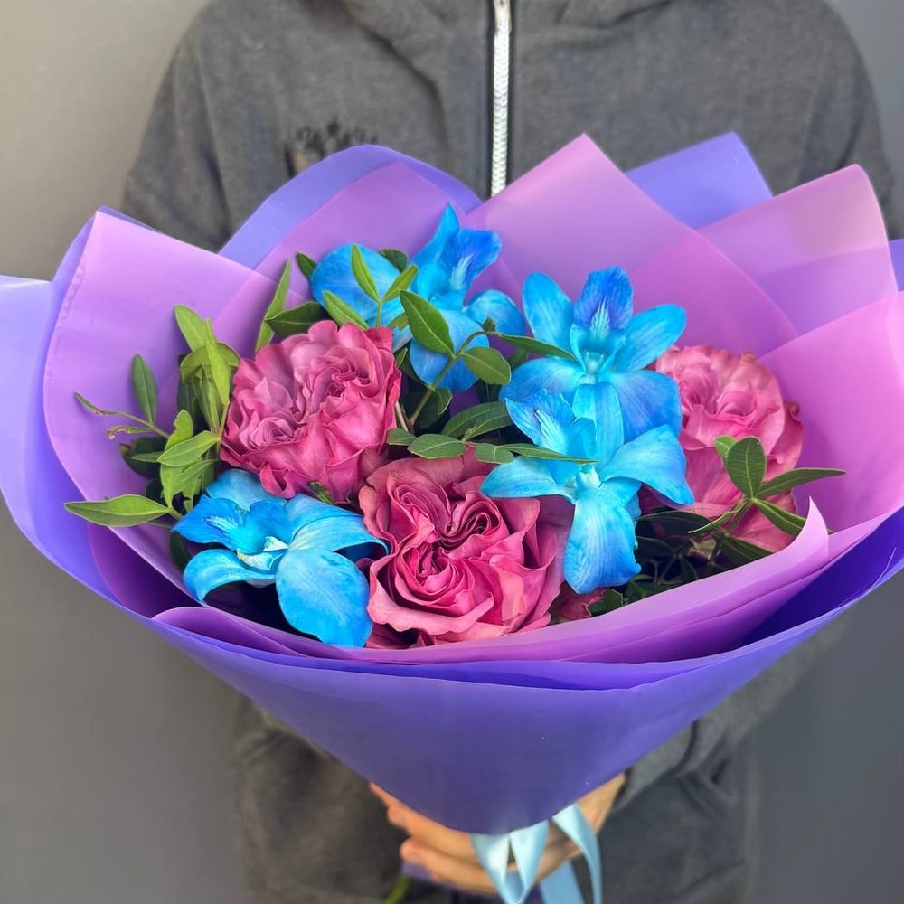 3 пионовидные розы розового цвета 3 орхидеи голубого цвета листья фисташки флористическая упаковка