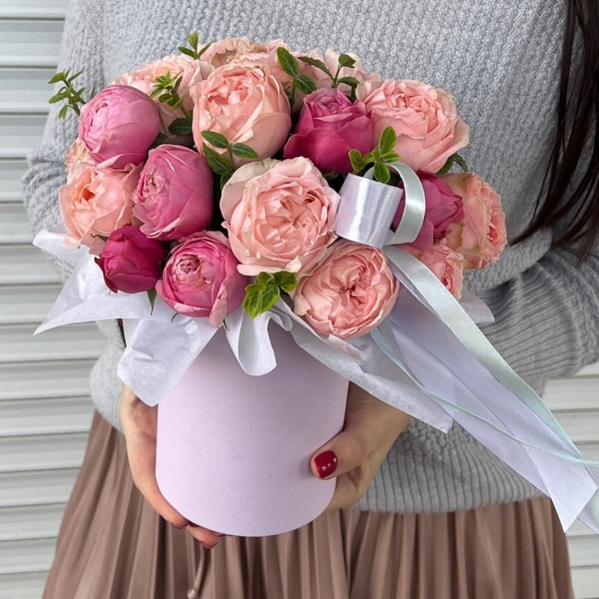 Небольшая композиция цветов из пионовидной кустовой розы в шляпной коробке в нежно розовом оттенке создаст непременно весеннее и романтическое настроение, легкий аромат цветов придаст ощущение свеж...