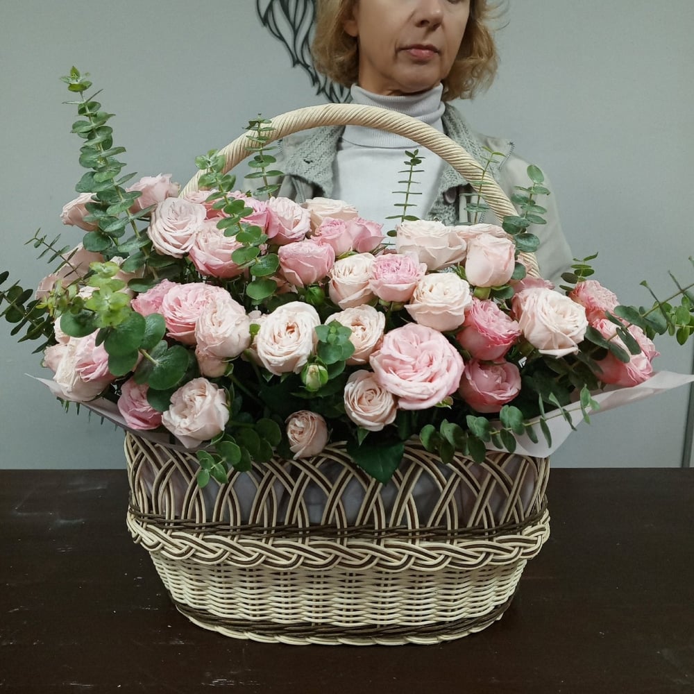 Корзина с цветами «Пионовидные кустовые розы с эвкалиптом»