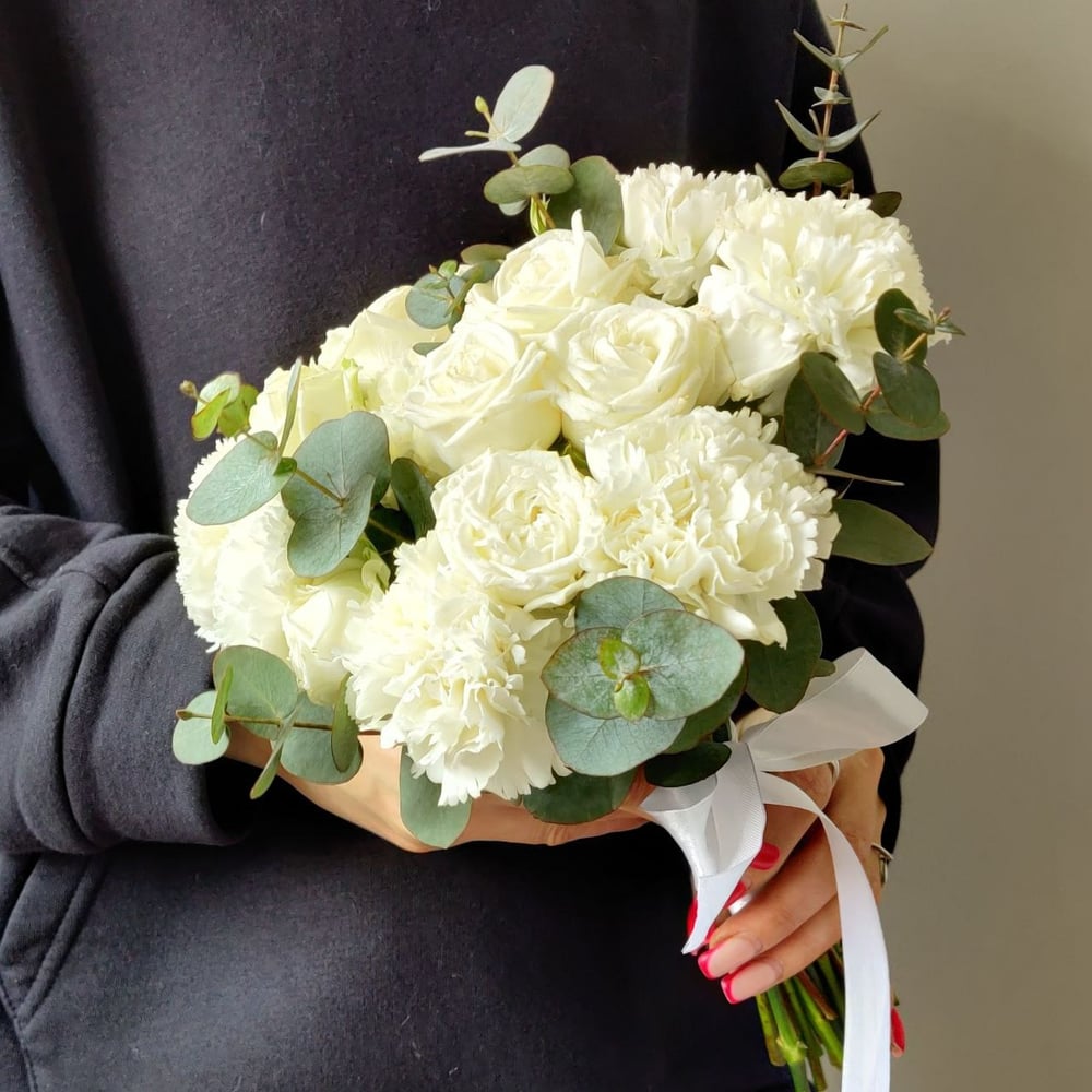 Этот букет невесты выполнен в нежном и элегантном стиле. Основу композиции составляют белые кустовые пионовидные розы, которые придают букету объем и изысканность. В сочетании с ними использованы бел…