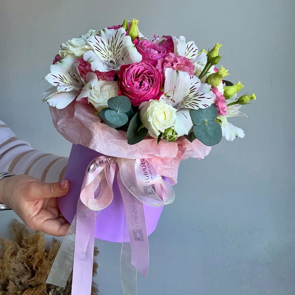 Шляпная коробка с цветами «Пионовидные розы в коробке для дочки S» из альстромерий и эустом
