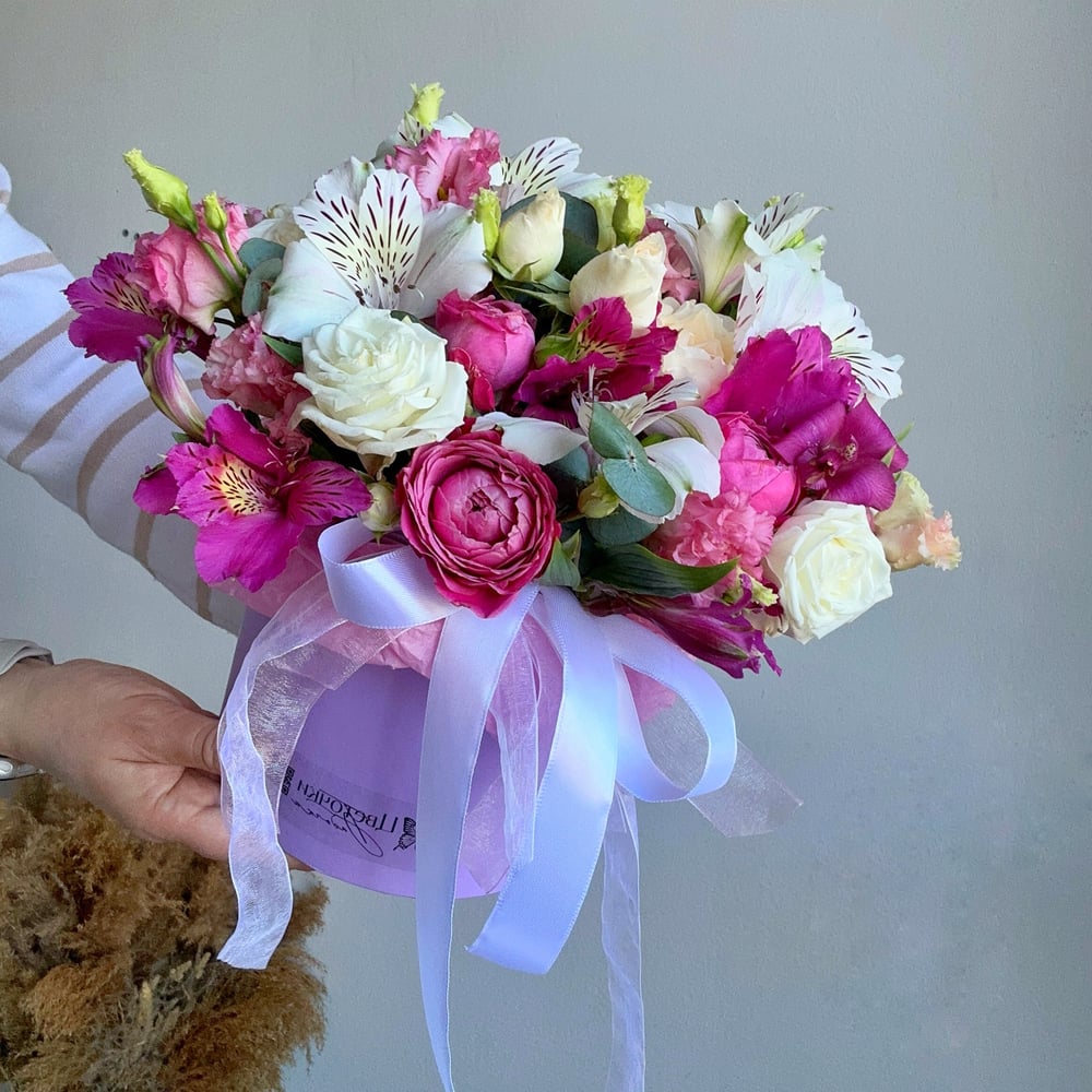 Шляпная коробка с цветами «Пионовидные розы в коробке для мамы М» из альстромерий и эустом
