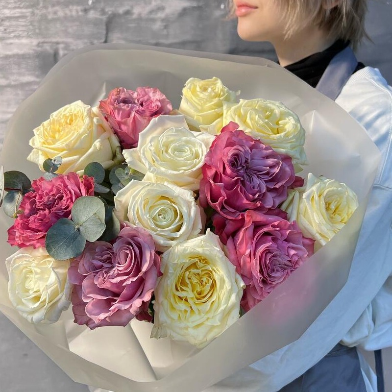 Яркий и стильный букет для яркой девушки из самых стойких пионовидных сортов роз Не забывайте, что цветы живые, поэтому уход за букетом требуется ежедневный.