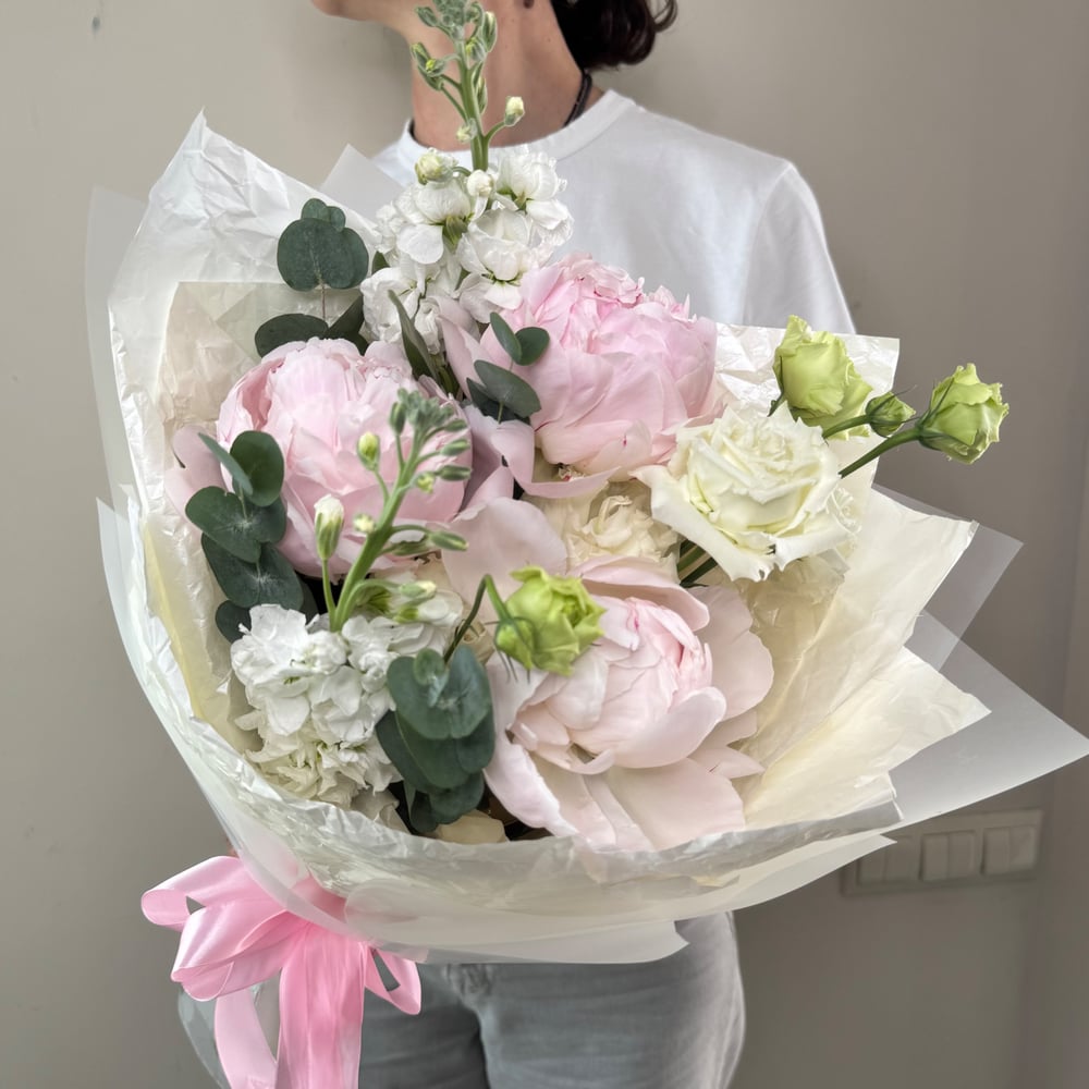 Букет «Пионы с маттиолой» из экзотических цветов и эустом