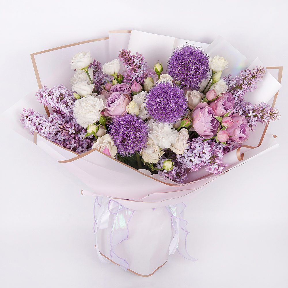 Букет, который умеет очаровывать с первого взгляда. Пионовидные и кустовые розы создают роскошный объем, лизиантус добавляет нежности, гвоздики — фактуры, сирень — романтичного настроения, а аллиум дает стильный “вау”-акцент. Всё оформлено в современной упаковке, чтобы выглядело модно и дорого.