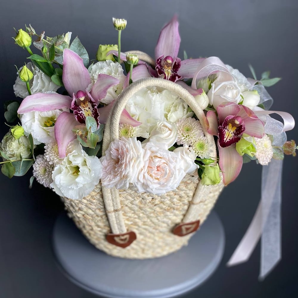 Коробка с цветами «Плетёная сумочка с цветами» из эустом и орхидей