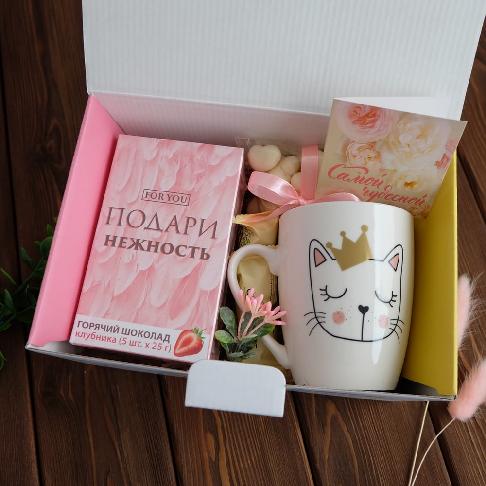 В наборе: 📌Коробка 22*15*10 см 📌Горячий шоколад со вкусом клубники 📌Кружка 350 мл 📌Кешью в белом шоколаде 📌Мультизлаковые конфеты 📌Открытка